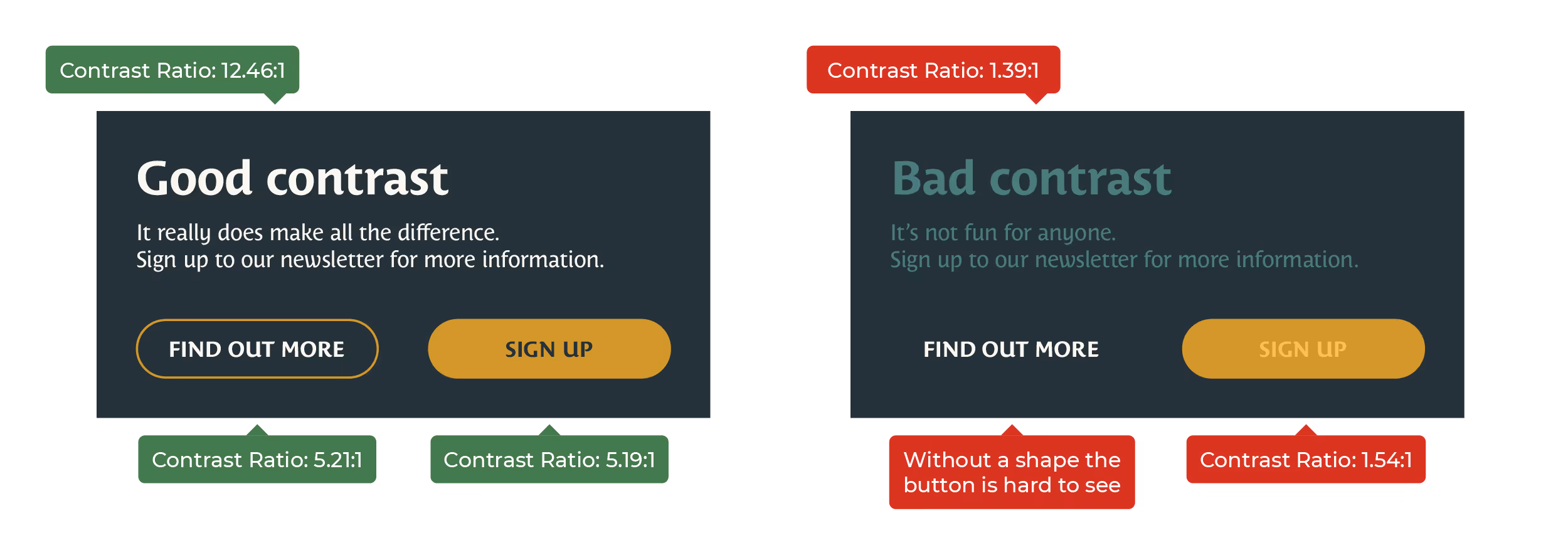 Colour is a great way to show off your brand’s personality. But as well as the colour choices themselves, you need to think about colour contrast. Important for those with vision and cognitive impairments and lower specification devices, the correct contrast ratio makes text easier to read. You should have a minimum of 4.5:1 contrast ratio between foreground and background elements, although larger or bold text (18pt/24px and above) can go down to 3:1. As well as contrast, it’s important to check that designs work in colour and greyscale. Use a combination of shapes, text styles and colour to highlight content, rather than rely on colour alone.